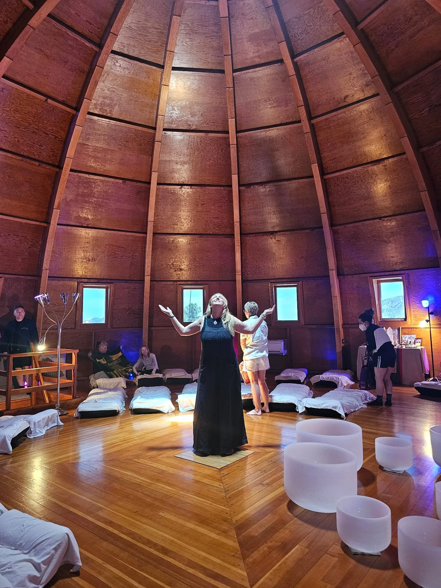Since 2018, she has drawn from her wellness training and corporate experience to offer workplace wellness sound baths for corporations, schools, educators, students, and healthcare professionals, supporting stress relief, focus, and emotional well-being. She also leads private events and weekly classes, creating restorative spaces for relaxation and healing.